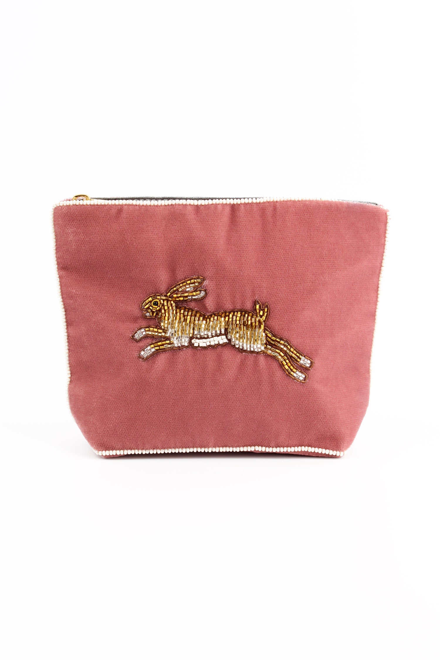 Perfect for animal lovers, our playful hare small pouch is a must-have this season. Made from beautiful gold and bronze beads on a dusty pink velvet.